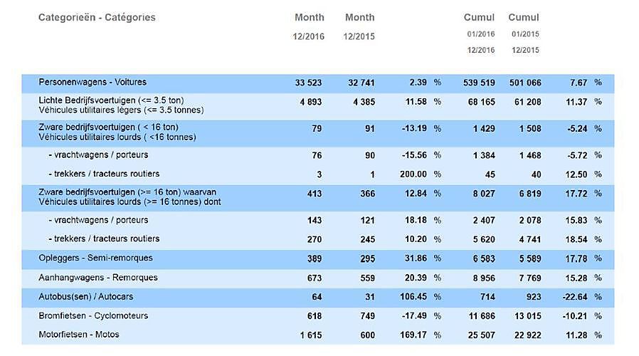 De Federale Overheidsdienst Mobiliteit en Vervoer en de Belgische Automobiel- en tweewielerfederatie Febiac, hebben zopas enkele cijfers over 2016 bekendgemaakt. Zo zijn er in België vorig jaar 539.519 nieuwe auto's ingeschreven. Dat is een toename van 7,7% ten opzichte van het aantal inschrijvingen in 2015 en het derde beste jaar ooit wat betreft inschrijvingen van nieuwe personenwagens, na recordjaren 2011 (572.211) en 2010 (547.347). Het aandeel benzinewagens van de nieuw ingeschreven auto's is gestegen van 37,8% naar 44,1% ten opzichte van vorig jaar, terwijl het aandeel dieselwagens is gedaald van 60% naar 52%. Dat is het laagste percentage sinds 1998. Daarnaast valt een mooie vooruitgang op te merken bij de hybride voertuigen. Daarvan bedraagt het marktaandeel 3% op meer dan 15.400 nieuw ingeschreven voertuigen in november 2016. De lichte vrachtvoertuigen sluiten 2016 af met een toename van 11,4% op een totaal van 68.125 nieuw ingeschreven bestelwagens. Vrachtvoertuigen van minder dan 16 ton laten een daling van 5,2% optekenen ten opzichte van vorig jaar, maar zware voertuigen boven de 16 ton een toename met 17,7%, ondersteund door de invoering van de nieuwe EURO-VI emissienorm begin dit jaar. Voor de motorbranche was 2016 een weerspiegeling van de maand december: uitzonderlijk. 25.507 nieuwe motorfietsen werden in 2016 in het verkeer gebracht, een toename van 11,3% in vergelijking met 2015.
