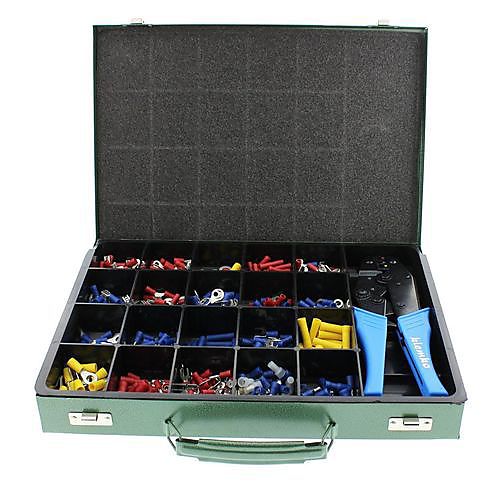 Assortiment kabelschoenen in overzichtelijke kistKlemko Techniek brengt de metalen 21-vaks kist (910005), gevuld met een assortiment geïsoleerde kabelschoenen. Deze stevige kist heeft een uitneembaar binnenwerk van hard kunststof en een dubbele sluiting tegen onverwacht openspringen. De installateur kan in één oogopslag zien welke kabelschoen hij nodig heeft. Onder het uitneembare binnenwerk ligt de index. De installateur kan aan de hand van deze index makkelijk de vulling van een vak nabestellen. De assortimentskist bevat ook de sperkrimptang SKT-0560-GKS (903050) met ergonomische handgrepen. De installateur levert met dit gereedschap een uitstekende persverbinding. De tang komt tijdens het aansluitwerk pas los als de persing volledig is.
