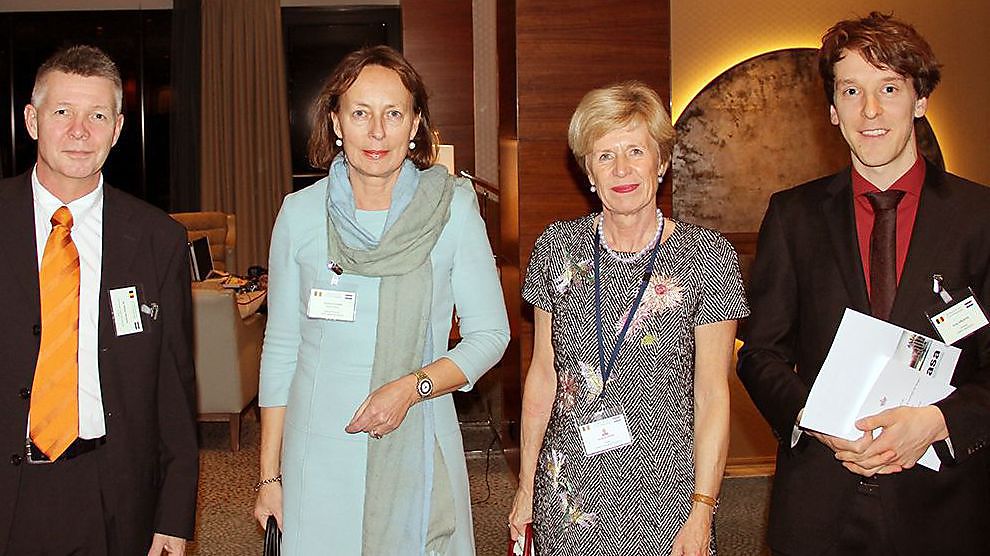 Foto - v.l.n.r.: Jan Willem Mulder (Evides), Annette Ottolini (Evides), rector Anne De Paepe (UGent) en prof. Arne Verliefde (UGent)