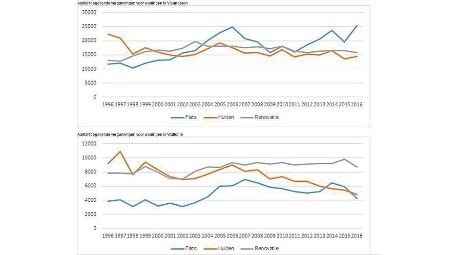 2016 was een goed jaar voor de Vlaamse nieuwbouwmarkt. Met een totaal van ongeveer 40.000 vergunningen deed de nieuwbouwmarkt het namelijk heel wat beter dan in 2015. Veel is te danken aan de appartementsbouw, die in 2016 met maar liefst 30% groeide en daardoor een aandeel bereikt heeft van 64%. De positieve evolutie blijft echter beperkt tot Vlaanderen. De Waalse woningbouwmarkt evolueert ondertussen namelijk naar een historisch dieptepunt, met amper 9.000 toegekende vergunningen voor nieuwe woongelegenheden en een aandeel van de appartementsbouw dat opnieuw naar 47% zakt. De verschillen zijn volgens de Vlaamse Confederatie Bouw onder andere te wijten aan een verschillend ruimtelijk beleid, meerbepaald de verstrenging van de EPB-eisen en nadruk op verdichting in Vlaanderen. Toch blijken het Vlaamse en Waalse Gewest ook nog wat met elkaar gemeen te hebben. In beide gewesten blijft het aantal vergunde woningrenovaties namelijk ondermaats, met cijfers die rond 16.000 (Vlaanderen) en 9.000 (Wallonië) blijven stagneren.