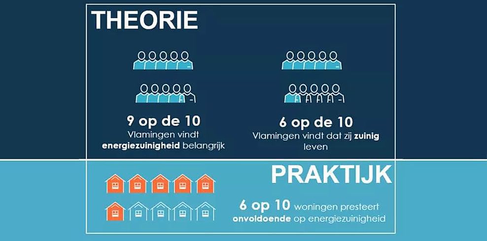 Negen op de tien Vlamingen vindt energiezuinigheid belangrijk, maar toch voldoet zes op de tien woningen niet aan de energienorm. Dakisolatie is in 85% van de woningen aanwezig, spouwmuurisolatie komt met 47% op de tweede plaats en ruim 90% van de woningen heeft dubbelglas. Het zijn maar enkele cijfers uit de tweejaarlijkse bevraging ‘Rationeel Energiegebruik in Vlaanderen’ door het Vlaams Energie Agentschap bij 1.000 Vlamingen. Daaruit blijkt dat de gemiddelde Vlaming renoveren geen prioriteit vindt, maar dat hij ook te weinig op de hoogte is van de steunmaatregelen van de overheid. Slechts vier op de tien Vlamingen kent bijvoorbeeld de Vlaamse Energielening. Iets meer dan de helft van de Vlamingen weet wel dat er premies zijn voor isolatie, glas of zonneboilers, maar maakt er niet altijd gebruik van. De jongste instrumenten om renoveren aan te moedigen – zoals de totaalrenovatiebonus, de burenpremie, of korting op de onroerende voorheffing – zijn maar bij hooguit een kwart van de Vlamingen bekend. “Daar moet verandering in komen”, zegt Vlaams minister van Energie Bart Tommelein, “want energiezuiniger wonen resulteert in een lagere energiefactuur.” En dat zullen veel Vlamingen wel graag horen, want de voornaamste redenen waarom actie uitblijft zijn dat renoveren geen prioriteit is, dat er een gebrek aan financiële middelen is of dat de terugverdientermijn te lang is.