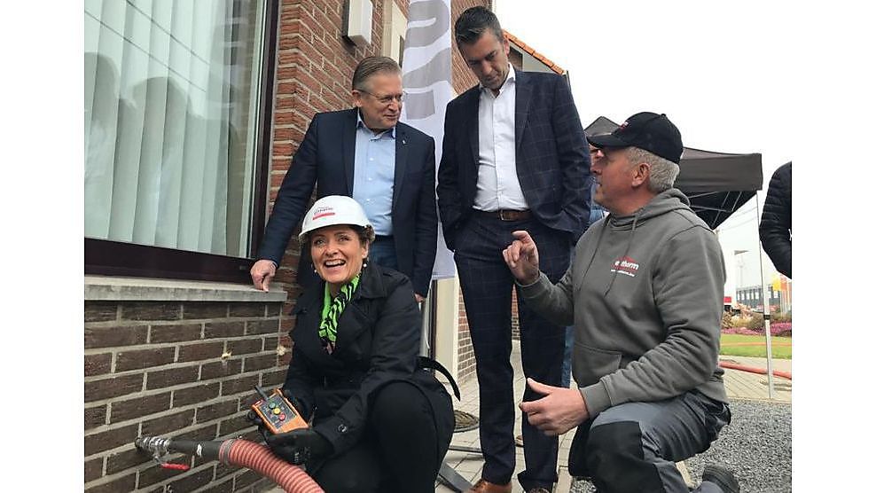 De 100.000e spouwmuurisolatie vond plaats in Elen, een deelgemeente van Dilsen-Stokkem. Daar is sociale huisvestingsmaatschappij ‘Ons Dak’ bezig met het grootste gezamenlijke na-isolatieproject in heel Vlaanderen; in één jaar tijd krijgen maar liefst 428 woningen spouwmuurisolatie. Lydia Peeters: “Ook in de sociale woningbouw en verhuursector is na-isolatie aangewezen. Dankzij de schaalgrootte van dit project kan de aannemer de werken goedkoper uitvoeren. De huurders verhogen hun wooncomfort én verlagen hun energiefactuur met 150 euro per jaar.”