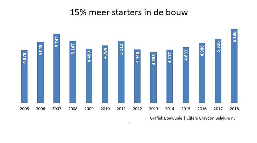 Vorig jaar startten in Vlaanderen 6.136 nieuwe bouwbedrijven. Dat waren er 810 meer dan in 2017, een stijging met 15%. Het aantal nieuwe ondernemingen zit al een paar jaar in de lift. De eerste cijfers voor 2019 geven aan dat deze trend zich doorzet.