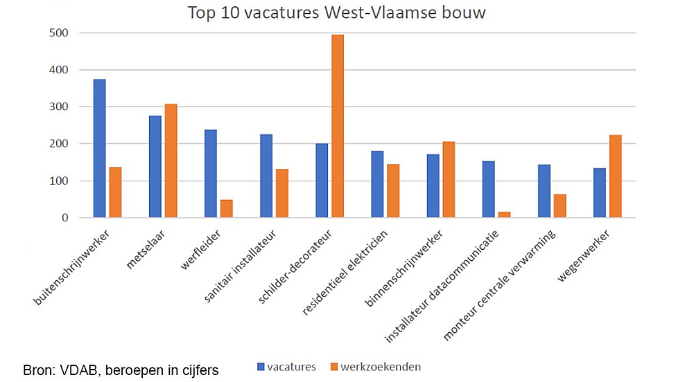 De West-Vlaamse bouwbedrijven zitten intussen met een groot aantal vacatures die maar niet ingevuld geraken. De functie van werfleider staat op de derde plaats in de top-10 van West-Vlaamse vacatures, daarnaast vinden ook vacatures terug voor sanitair installateur, residentieel elektricien en installateur van datanetwerken. Tegelijkertijd is de West-Vlaamse bouwsector intensief op zoek naar binnen- en buitenschrijnwerkers, metselaars en schilders-decorateurs.